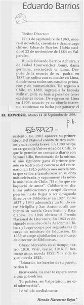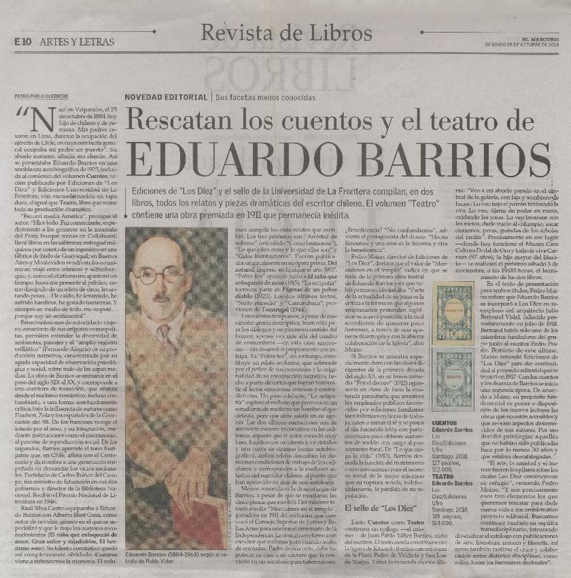 Rescatan los cuentos y el teatro de Eduardo Barrios [artículo] Pedro Pablo Guerrero.