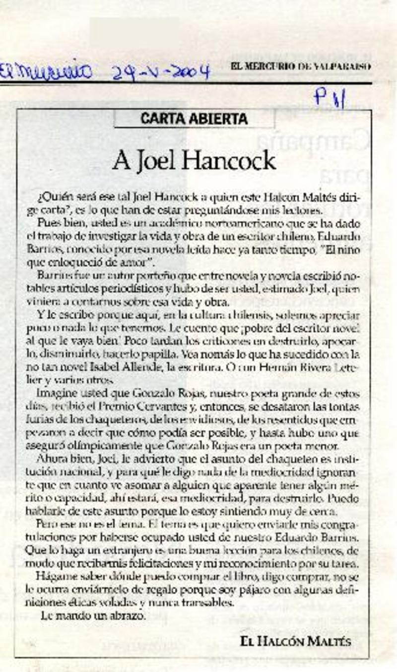 Hancock, Joel C. - Crónicas literarias de Eduardo Barrios - Autores internacionales - Autores chilenos - Barrios, Eduardo