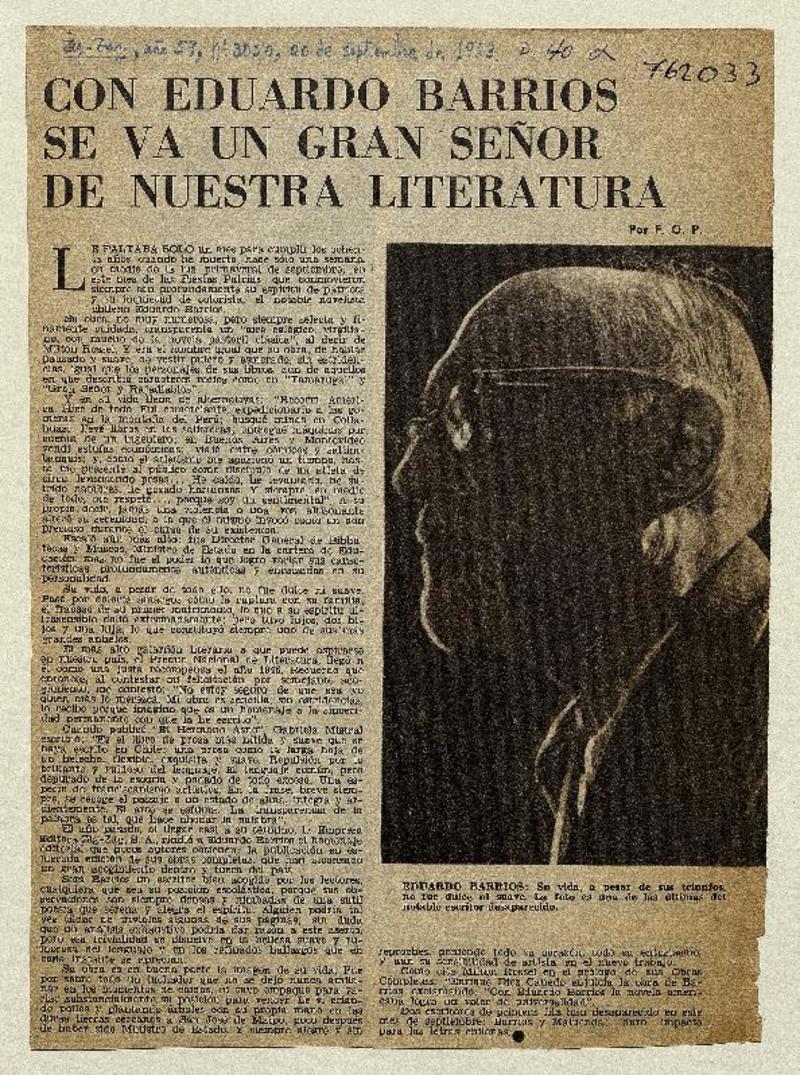 Con Eduardo Barrios se va un gran señor de nuestra literatura [artículo] F.O.P.