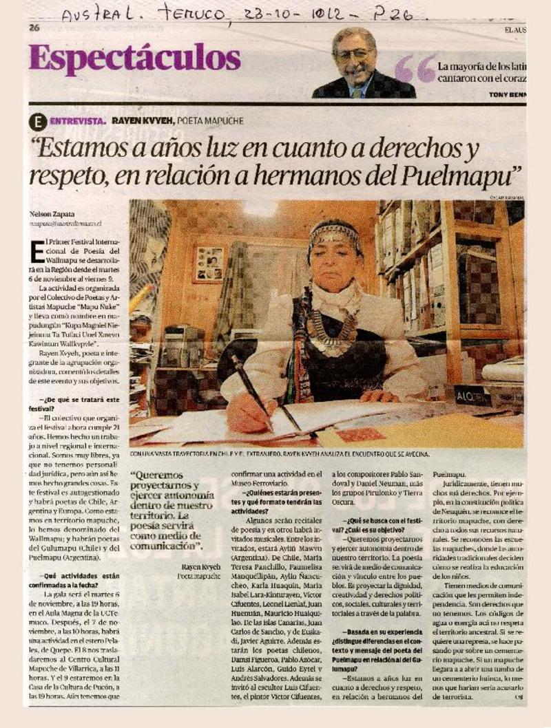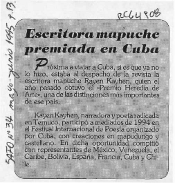 Poetisa mapuche distinguida con el Premio Heredia en Cuba [artículo] Eduardo Henríquez O.