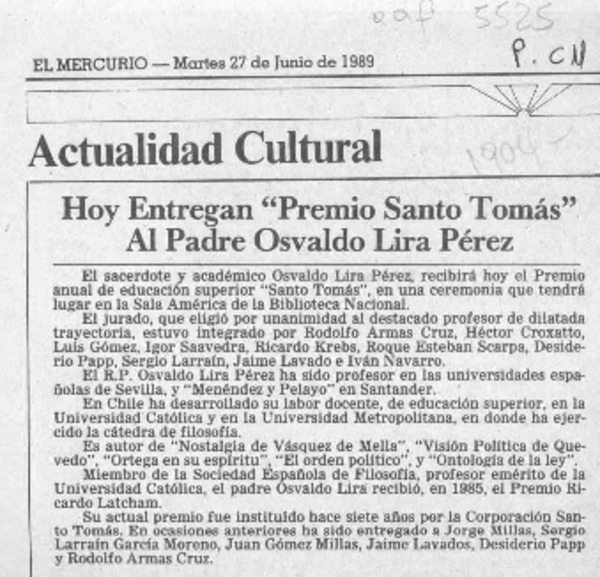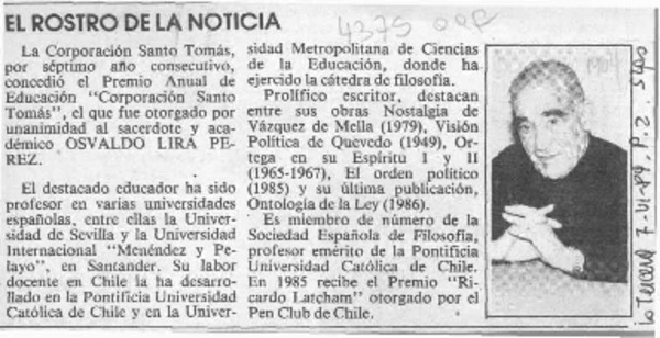 Hoy entregan "Premio Santo Tomás" al padre Osvaldo Lira Pérez [artículo].