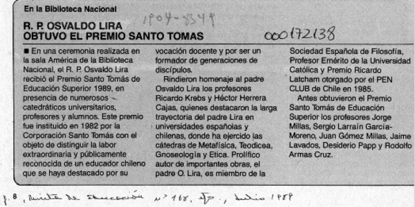 R. P. Osvaldo Lira obtuvo el premio Santo Tomás [artículo].