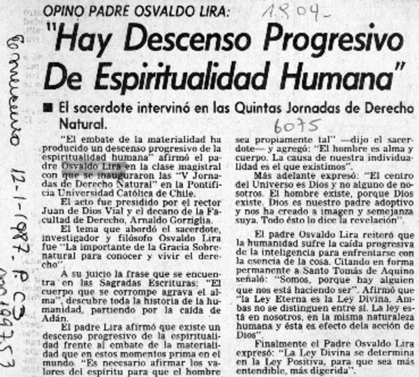Opinó padre Osvaldo Lira "Hay descenso progresivo de espiritualidad humana" [artículo].