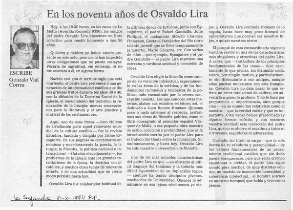 En los noventa años de Osvaldo Lira [artículo] Gonzalo Vial Correa.