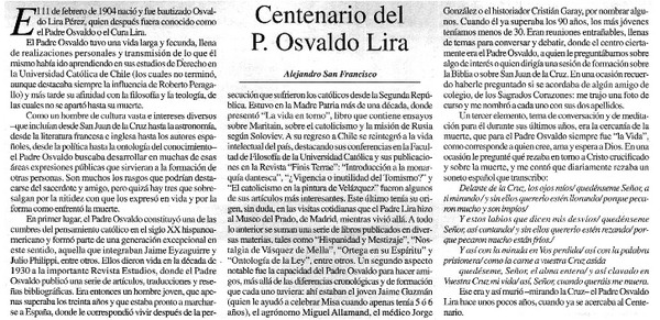 Centenario del P. Osvaldo Lira [artículo] Alejandro San Francisco.