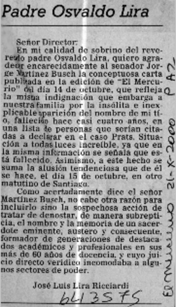 Padre Osvaldo Lira [artículo] José Luis Lira Ricciardi