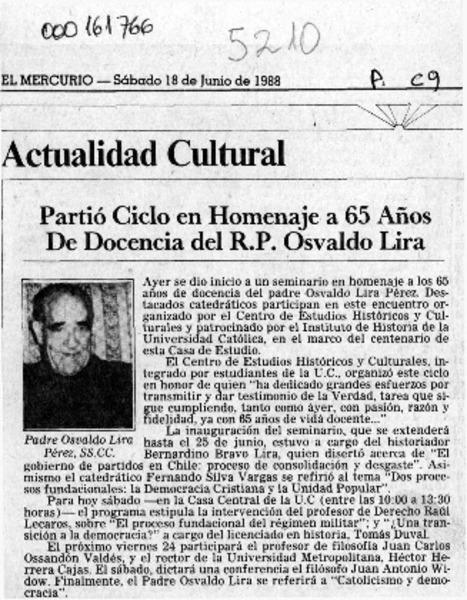 Partió ciclo en homenaje a 65 años de docencia del R. P. Osvaldo Lira [artículo].