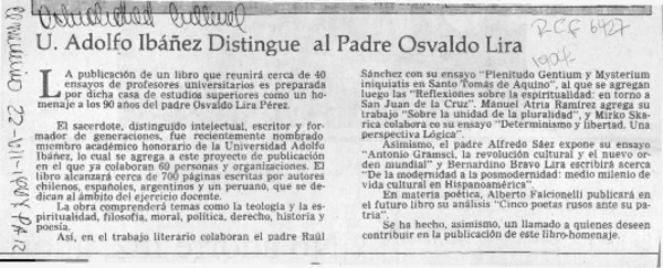 En preparación volumen de homenaje al R. P. Osvaldo Lira por sus 90 años [artículo].