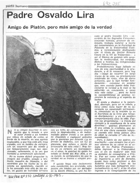 Padre Osvaldo Lira amigo de Platón, pero más amigo de la verdad : [Entrevista] [artículo] Rosario Guzmán E.