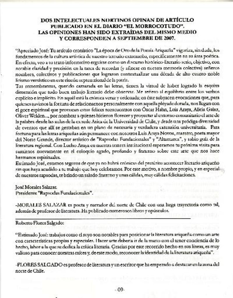 Dos intelectuales nortinos opinan de artículo Publicado en el Diario "El Morrocotudo". Las opiniones han sido extraidas del mismo medio y corresponden a septiembre de 2007 [artículo]