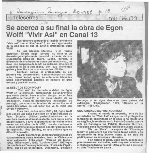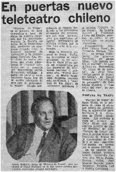 Egon Wolff, "Mi teleserie es muy diferente" [artículo] Pilar Entrala.