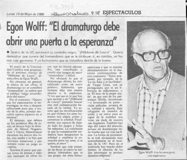 Egon Wolff "El dramaturgo debe abrir una puerta a la esperanza" [artículo].
