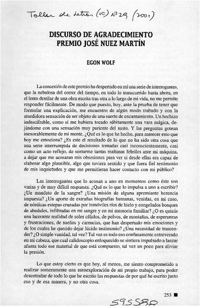 Discurso de entrega Premio José Nuez Martín a Egon Wolf [artículo] Carola Oyarzún