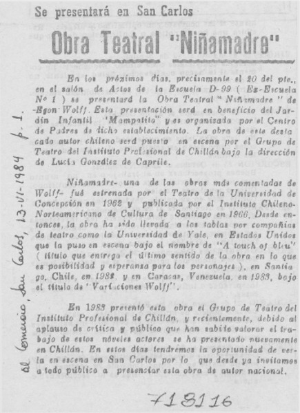 "Niñamadre", drama de Egon Wolff [artículo] Wilfredo Mayorga.