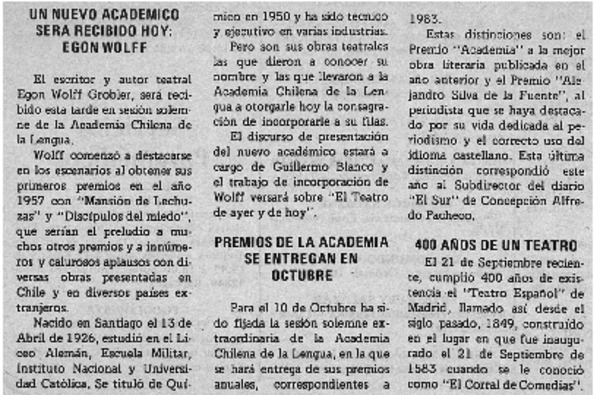 Un nuevo académico será recibido hoy: Egon Wolff. [artículo]