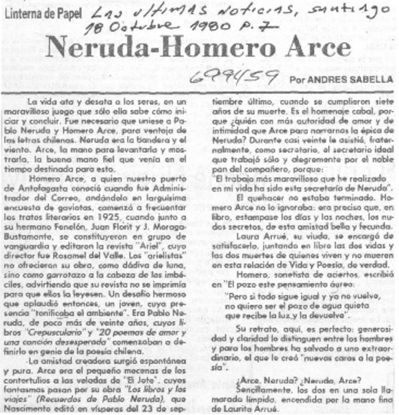 Neruda-Homero Arce [artículo] Andrés Sabella.
