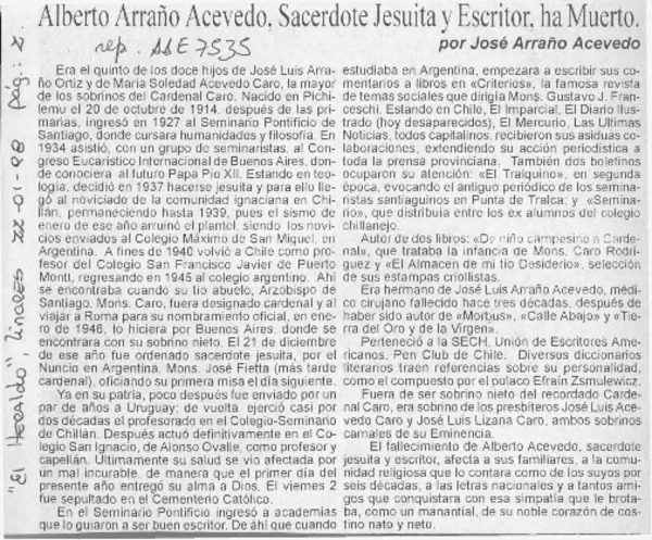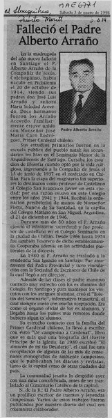 Alberto Arraño Acevedo, sacerdote jesuita y escritor, ha muerto [artículo] José Arraño Acevedo