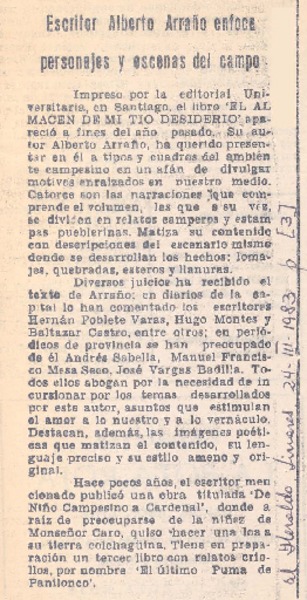 Escritor Alberto Arraño enfoca personajes y escenas del campo. [artículo]