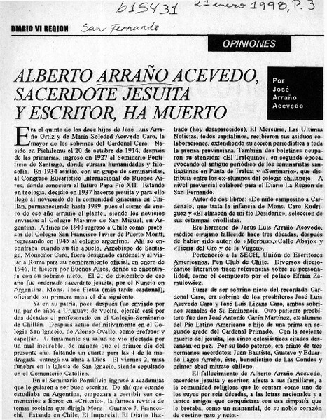 Alberto Arraño Acevedo, sacerdote jesuita y escritor, ha muerto [artículo] José Arraño Acevedo.