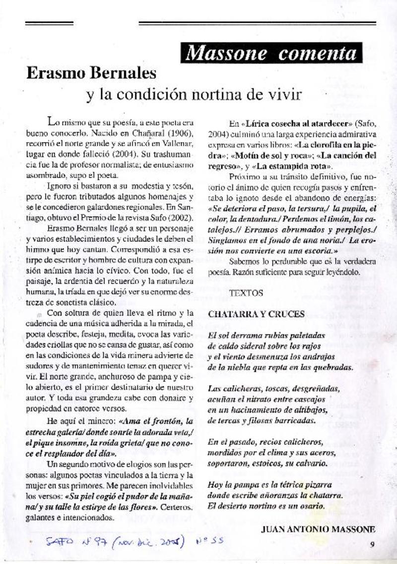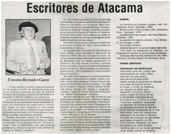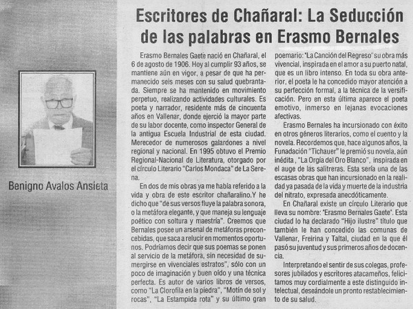 Escritores de Chañaral, la seducción de las palabras en Erasmo Bernales [artículo] Benigno Avalos A.