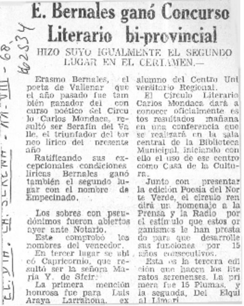 E. Bernales ganó concurso literario bi-provincial. [artículo]