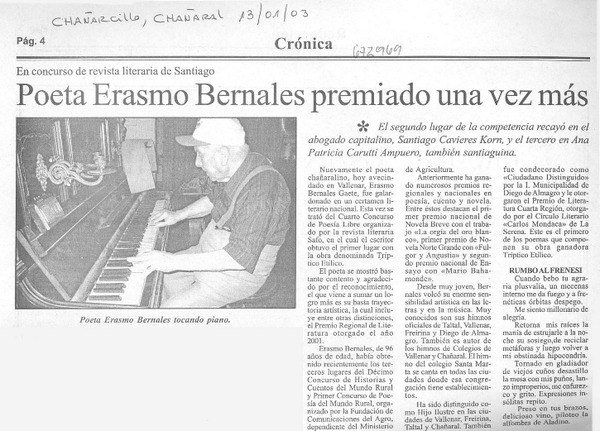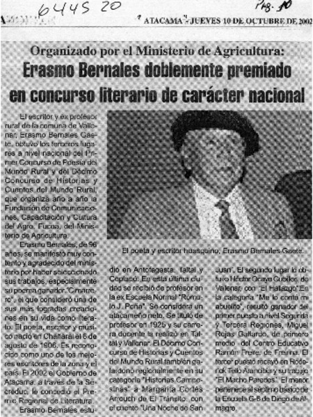Otro galardón obtuvo Erasmo Bernales Gaete. [artículo]
