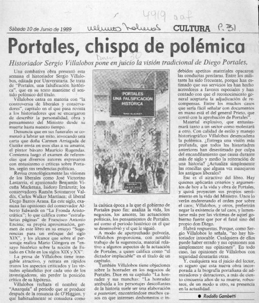 Portales, chispa de polémica [artículo] Rodolfo Gambetti.