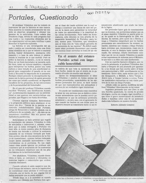Portales, cuestionado [artículo] Roberto Alliende González.
