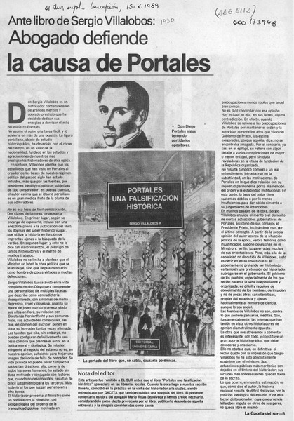 Ante libro de Sergio Villalobos, abogado defiende la causa de Portales [artículo] Mario Rojas Sepúlveda.