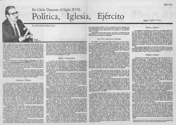 Política, Iglesia, Ejército en Chile durante el siglo XVII [artículo] Bernardino Bravo Lira.