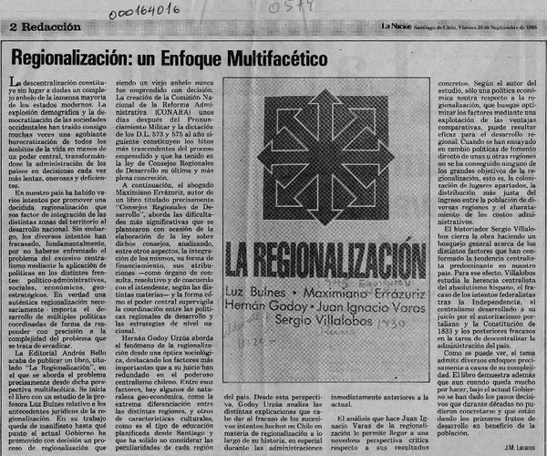 VILLALOBOS R., SERGIO - GODOY, HERNAN - ERRAZURIZ EGUIGUREN, MAXIMIANO - BULNES ALDUNATE, LUZ - REGIONALIZACION, LA - VARAS, JUAN IGNACIO