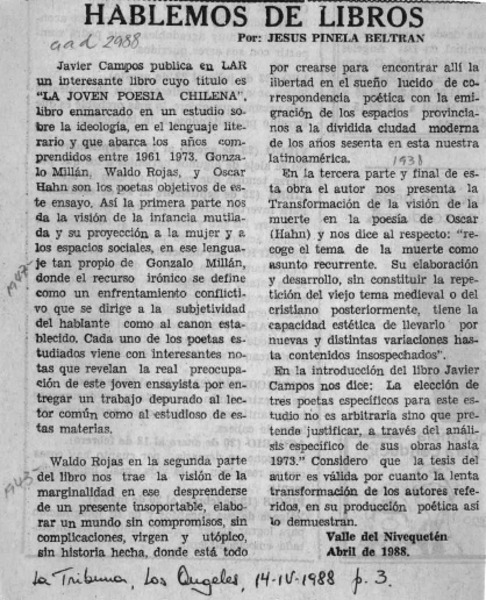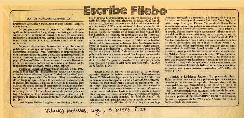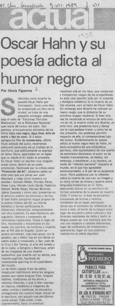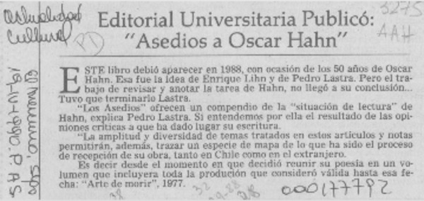 Pedro lastra y Enrique Lihn, "Asedios a Oscar Hahn" [artículo] Oscar Gomes.