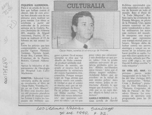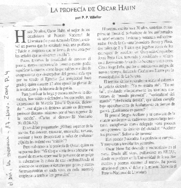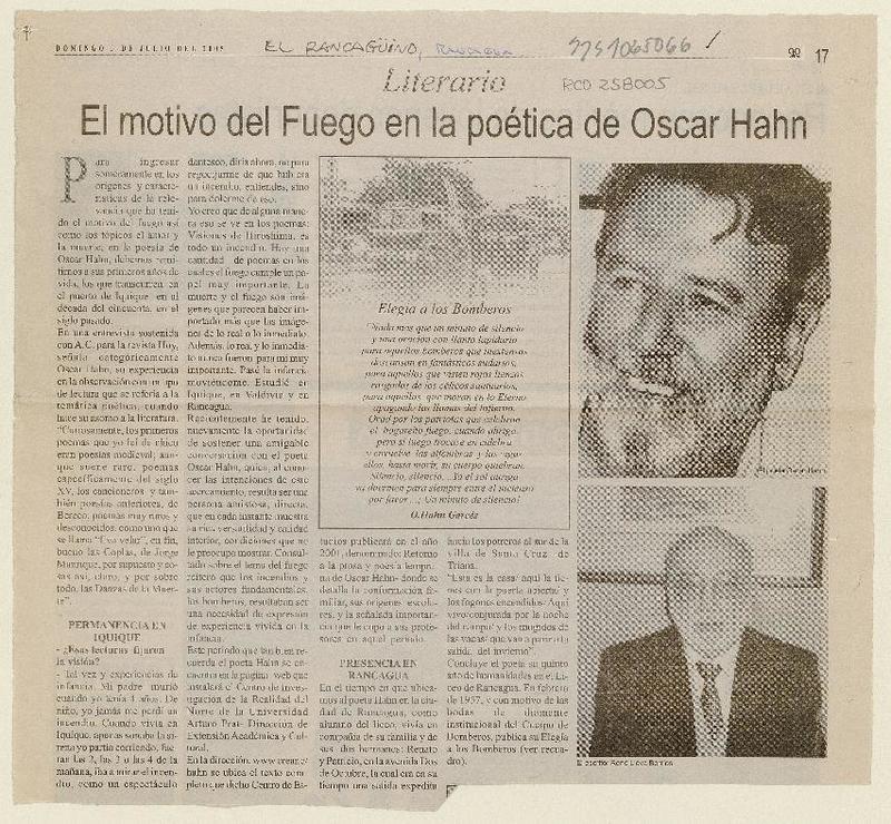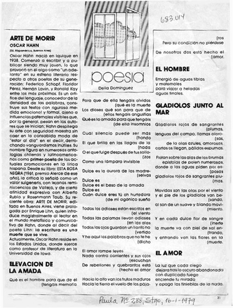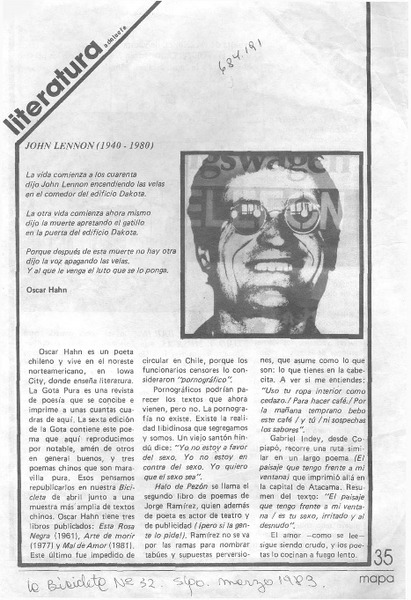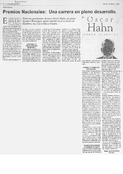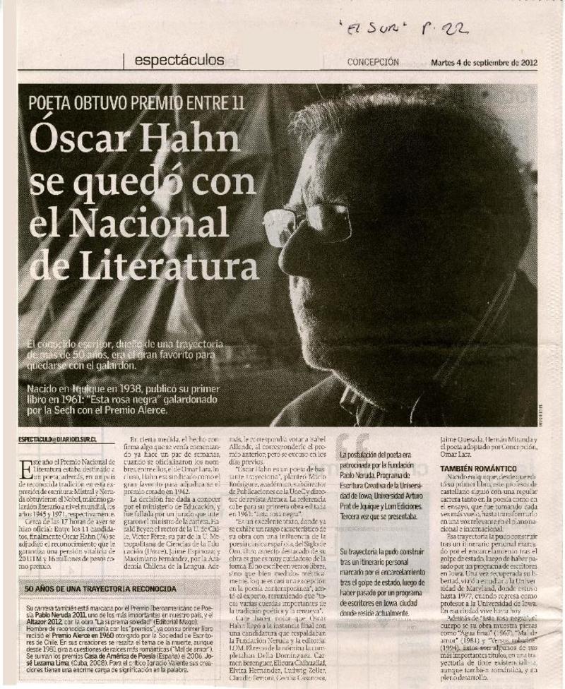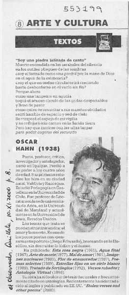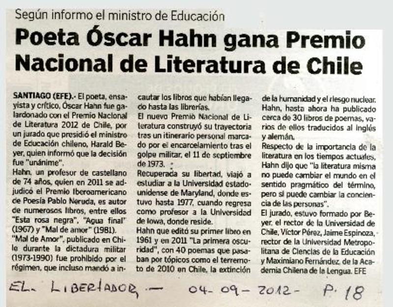 Premio Nacional de Literatura para el poeta Oscar Hanh (sic). Poeta nacido en 1938. [artículo]