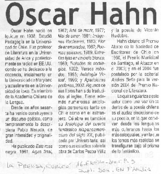 Autores chilenos - Entrevistas - Hahn, Óscar - Hahn, Oscar