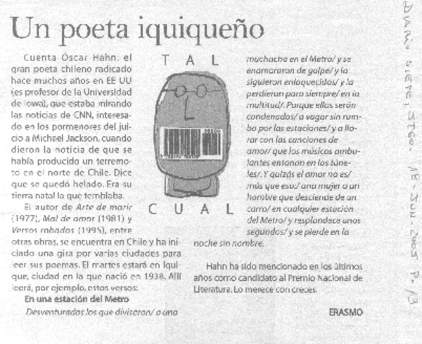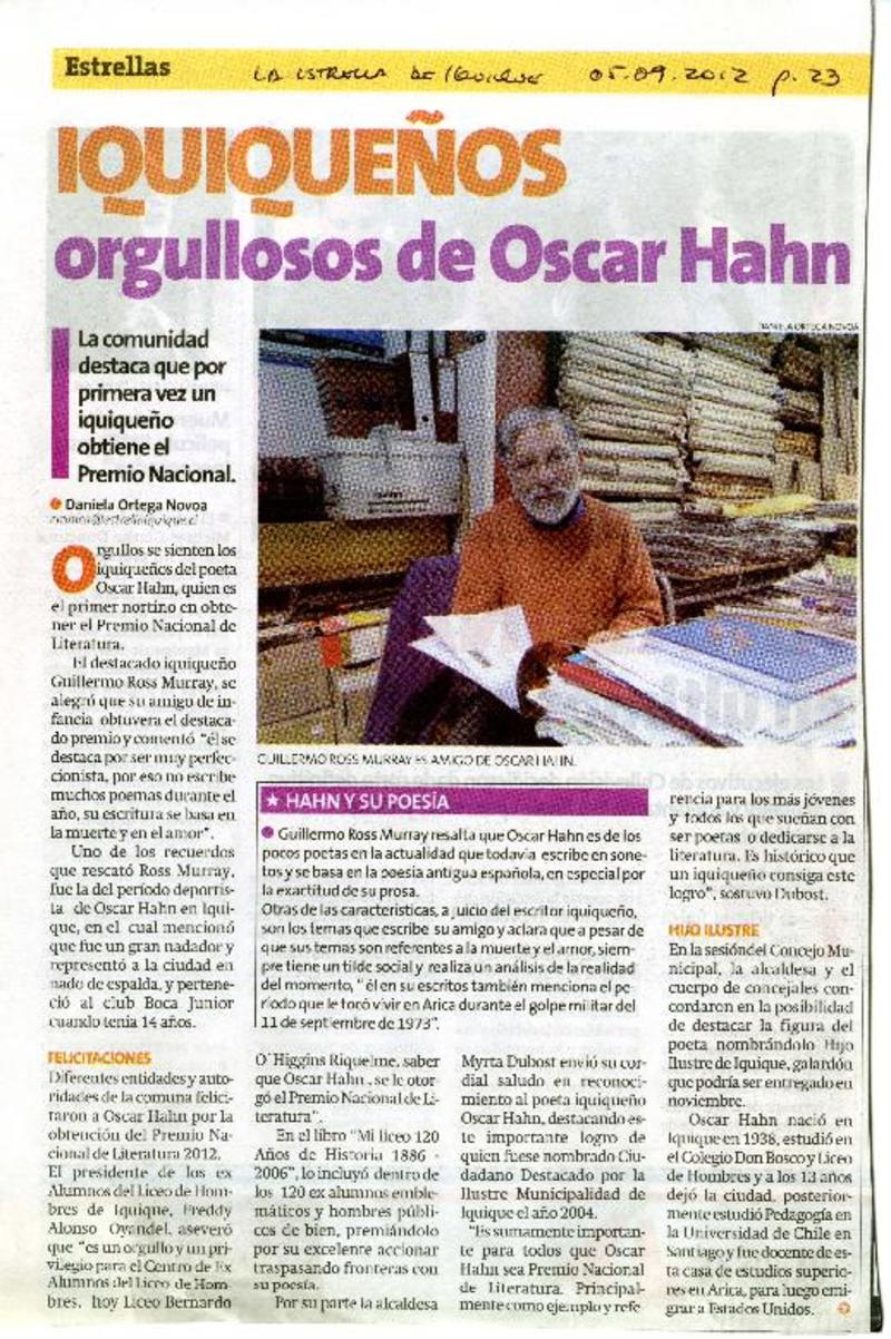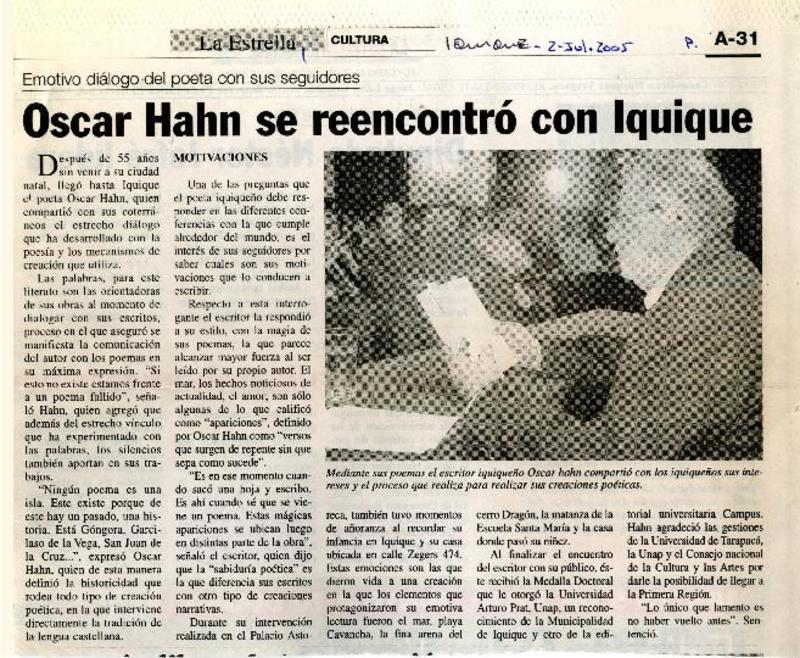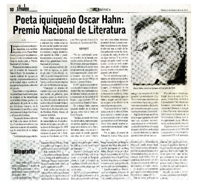 Poeta iquiqueño Oscar Hahn: premio nacional de literatura [artículo] J.C.N.