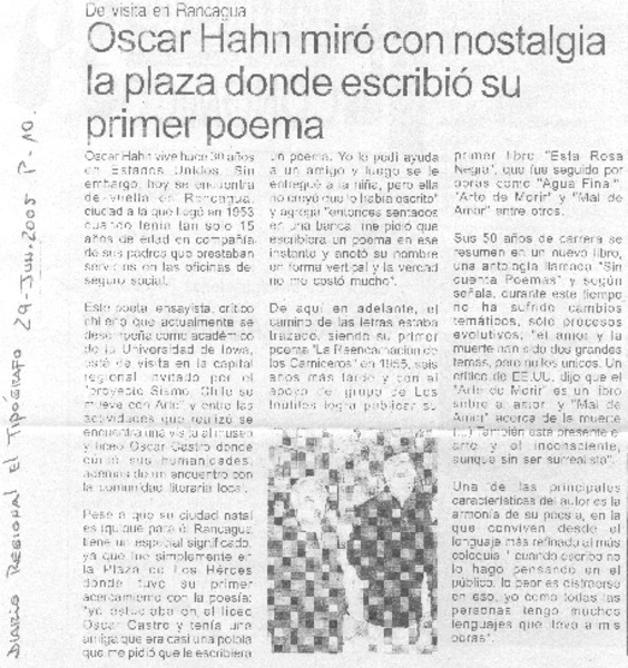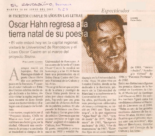 Oscar Hahn regresa a la tierra natal de su poesía [artículo] Loreto Correa.