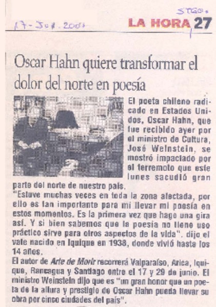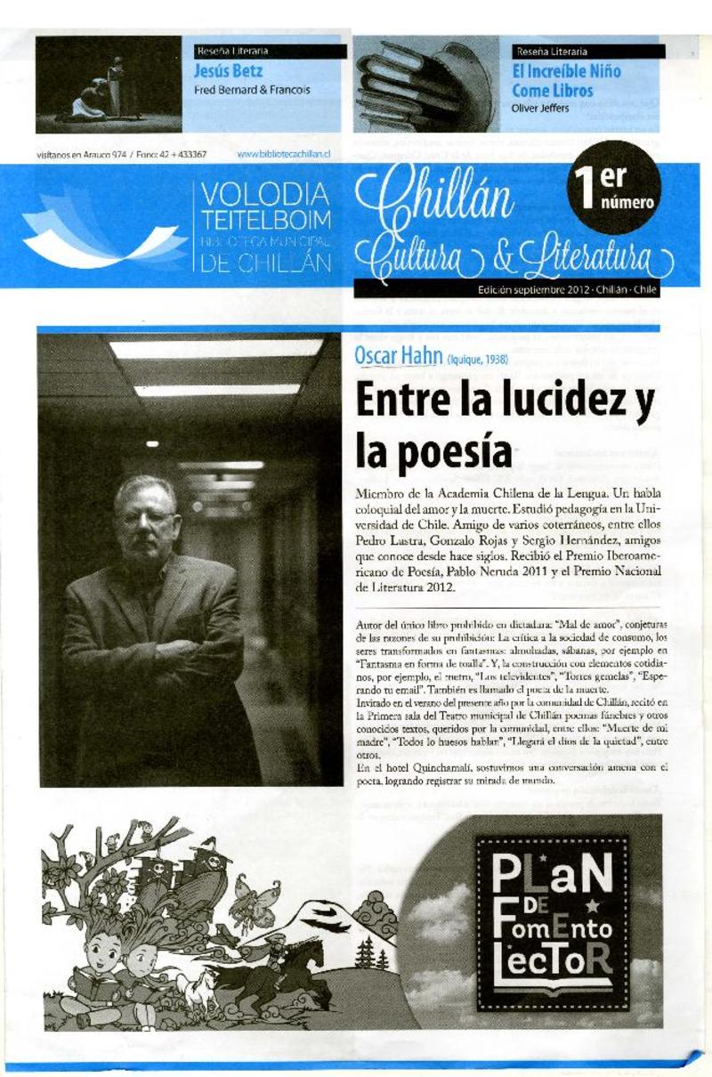 Poeta Óscar Hahn gana premio nacional de literatura de Chile. [artículo]