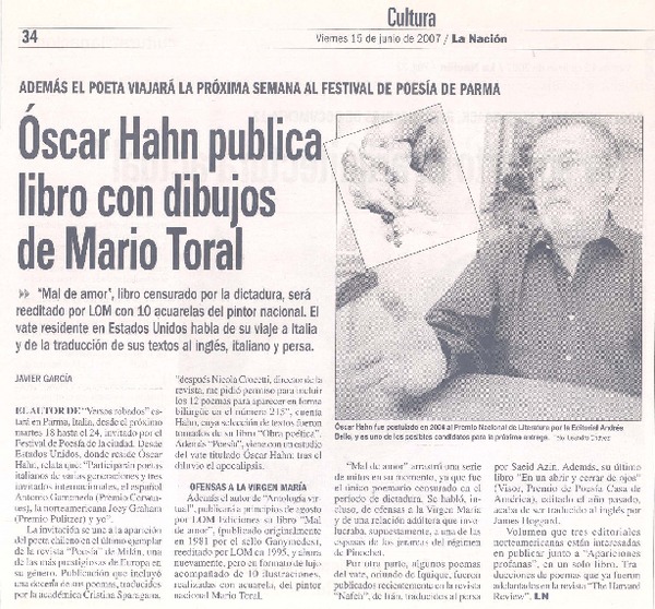 Oscar Hahn publica libro con dibujos de Mario Toral [artículo]Javier García.