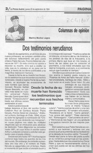 Dos testimonios nerudianos [artículo] Marino Muñoz Lagos.