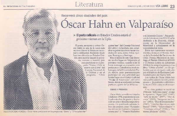 Recorrerá cinco ciudades del país : Oscar Hahn en Valparaíso [artículo]