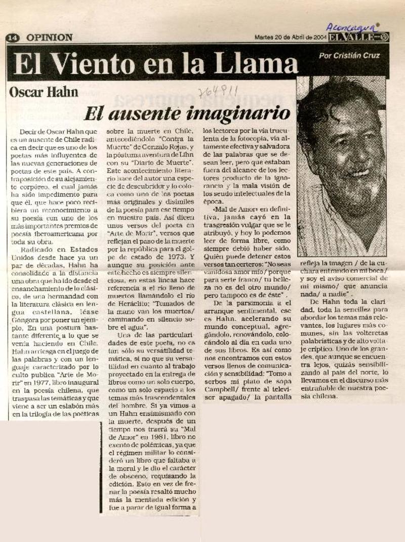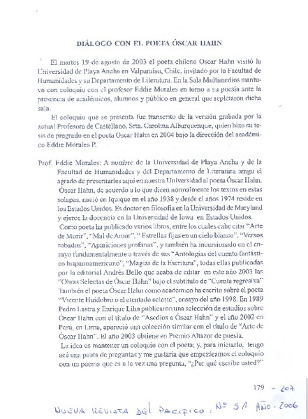 Diálogo con el poeta Oscar Hahn " [artículo]Eddie Morales.