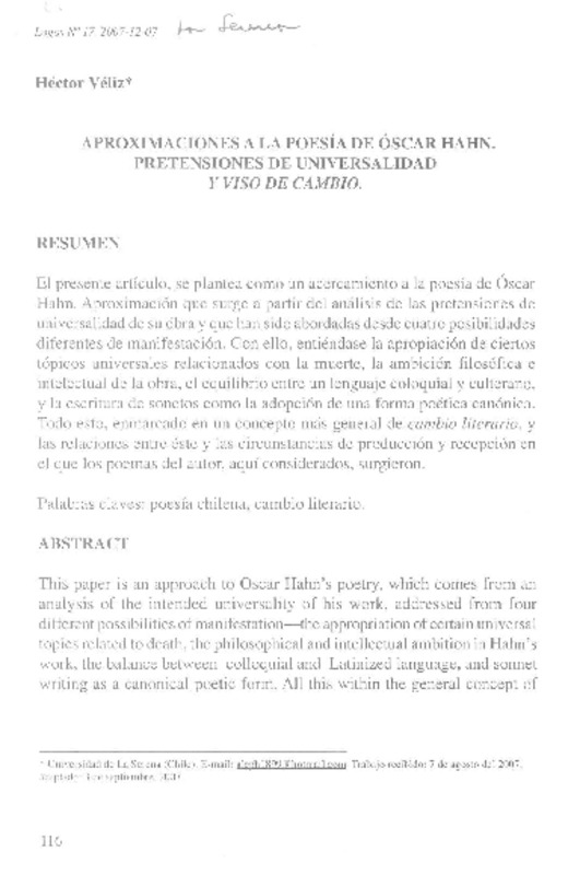 Aproximaciones a la poesía de Óscar Hahn. [artículo] Héctor Véliz.