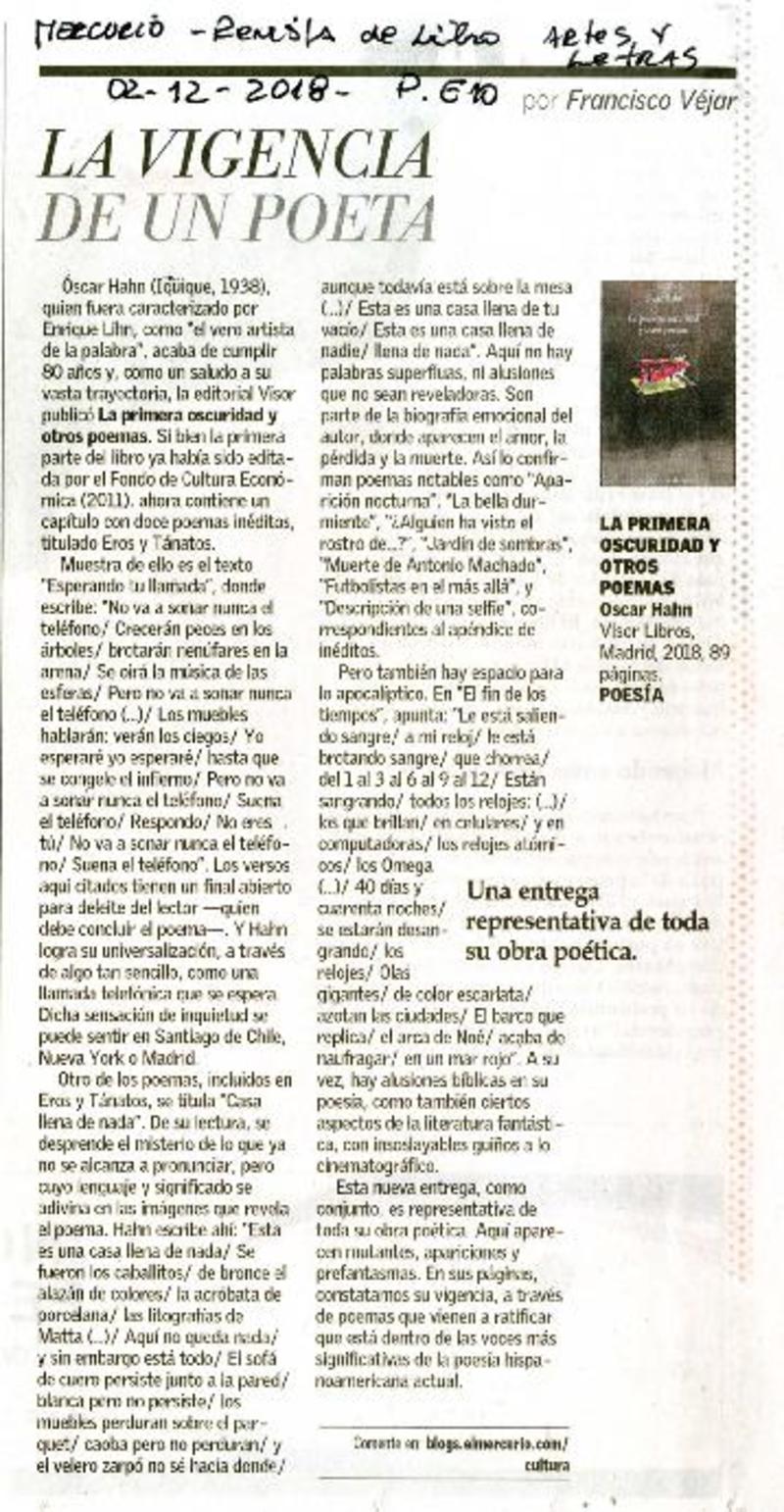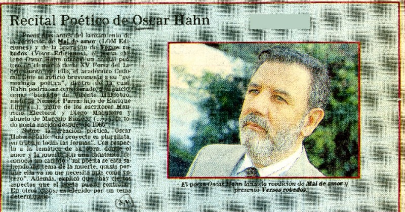 Oscar Hahn, "No creo en la originalidad de la vanguardia poética" [artículo] Cecilia Valdés Urrutia.
