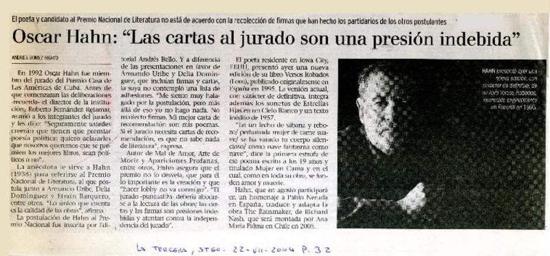 Oscar Hahn: "Las cartas al jurado son una presión indebida" [artículo] Andrés Gómez Bravo.