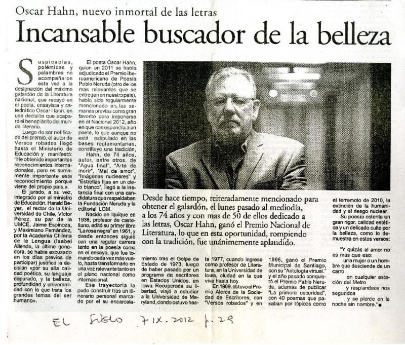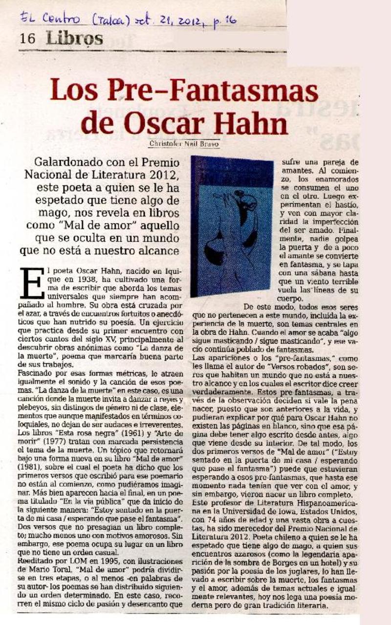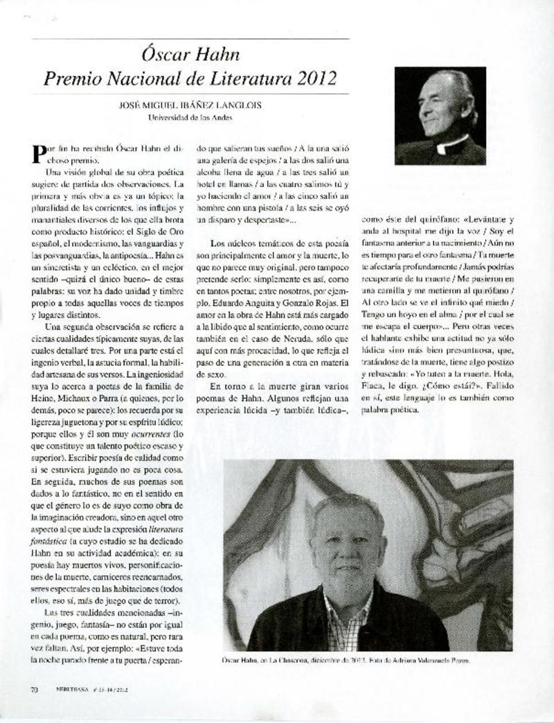 Óscar Hahn Premio Nacional de Literatura 2012 [artículo] José Miguel Ibañez Langlois