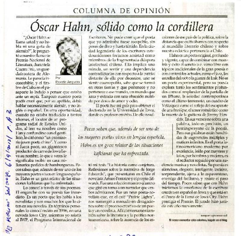 Óscar Hahn, sólido como la cordillera [artículo] Roberto Ampuero.