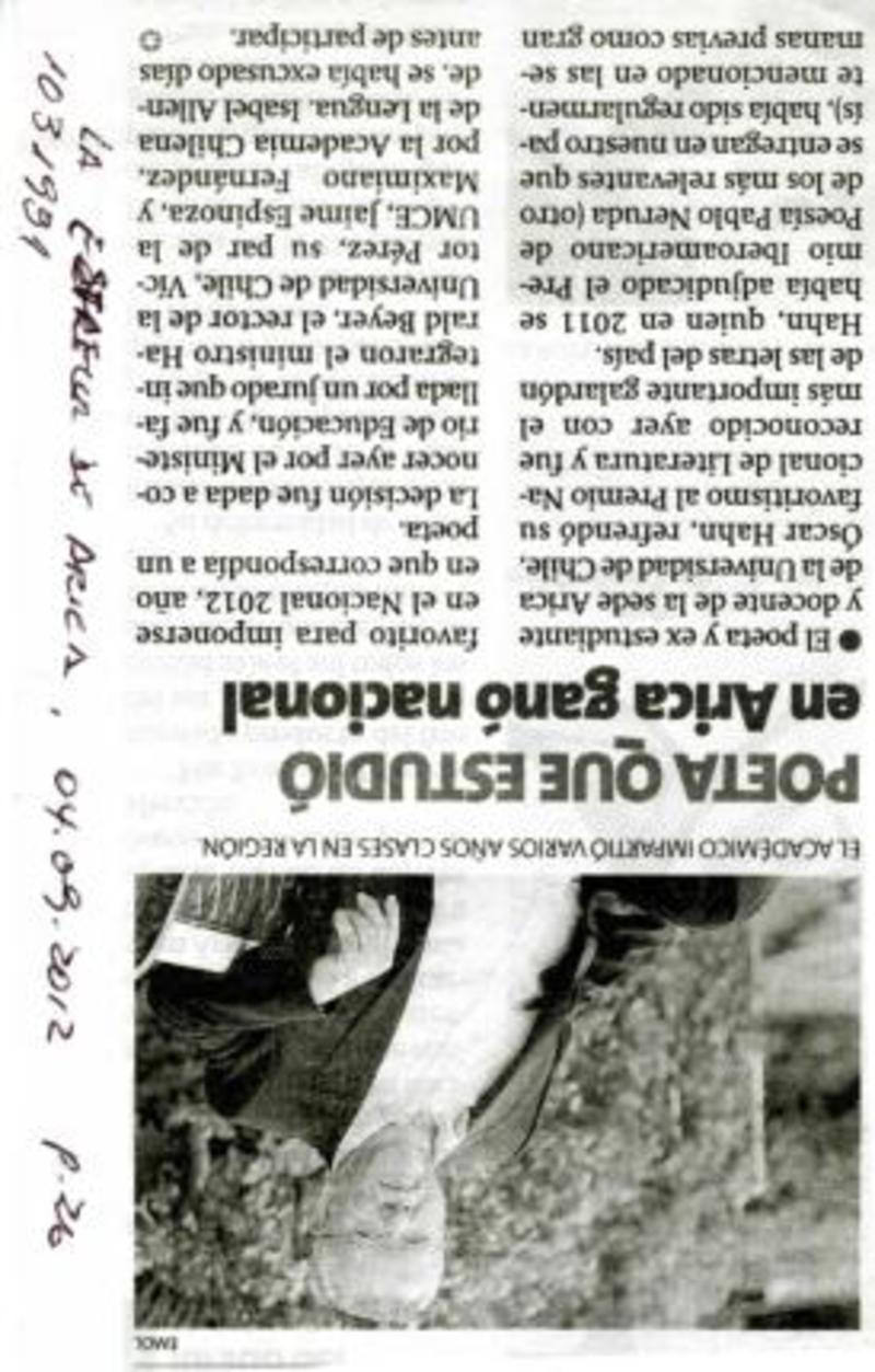 Poeta que estudió en Arica ganó nacional. [artículo]