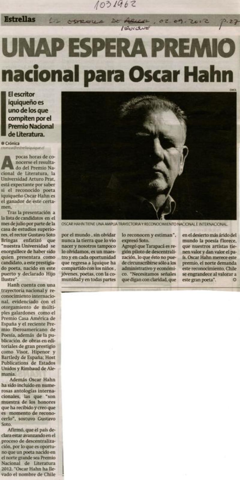Unap espera premio nacional para Oscar Hahn. [artículo]
