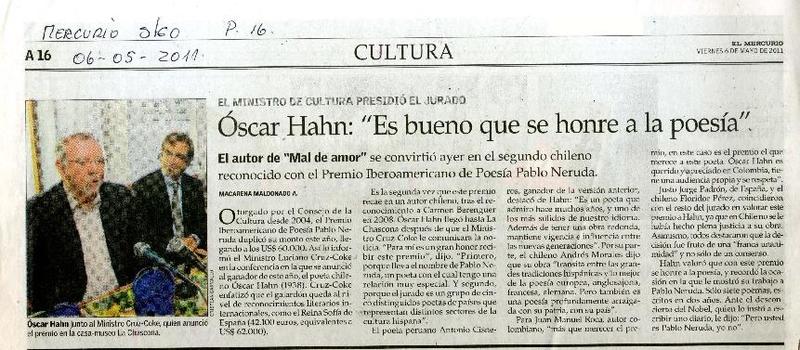 Oscar Hahn: "Es bueno que se honre a la poesía" [artículo] Macarena Maldonado A.
