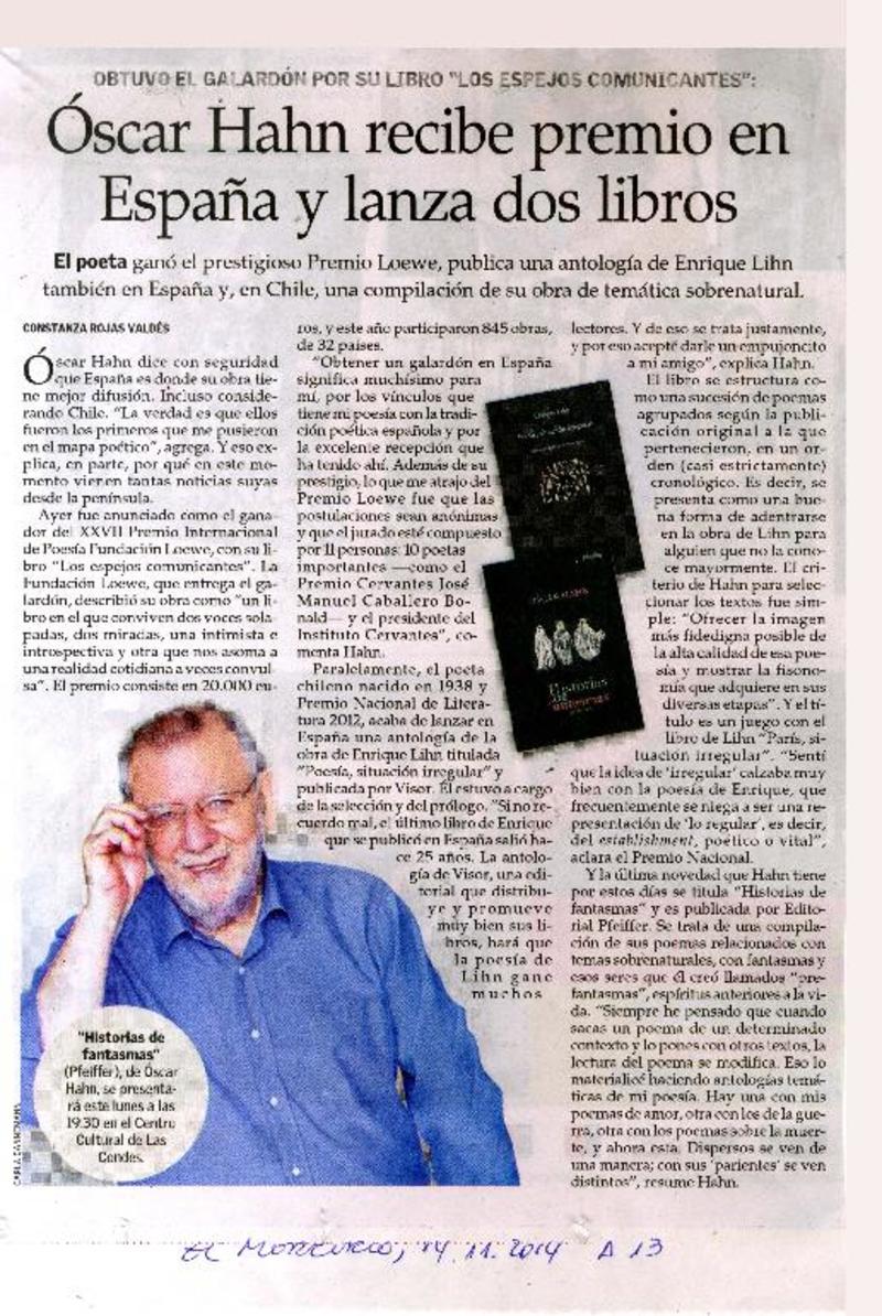 Óscar Hahn recibe premio en España y lanza dos libros [artículo] Constanza Rojas Valdés